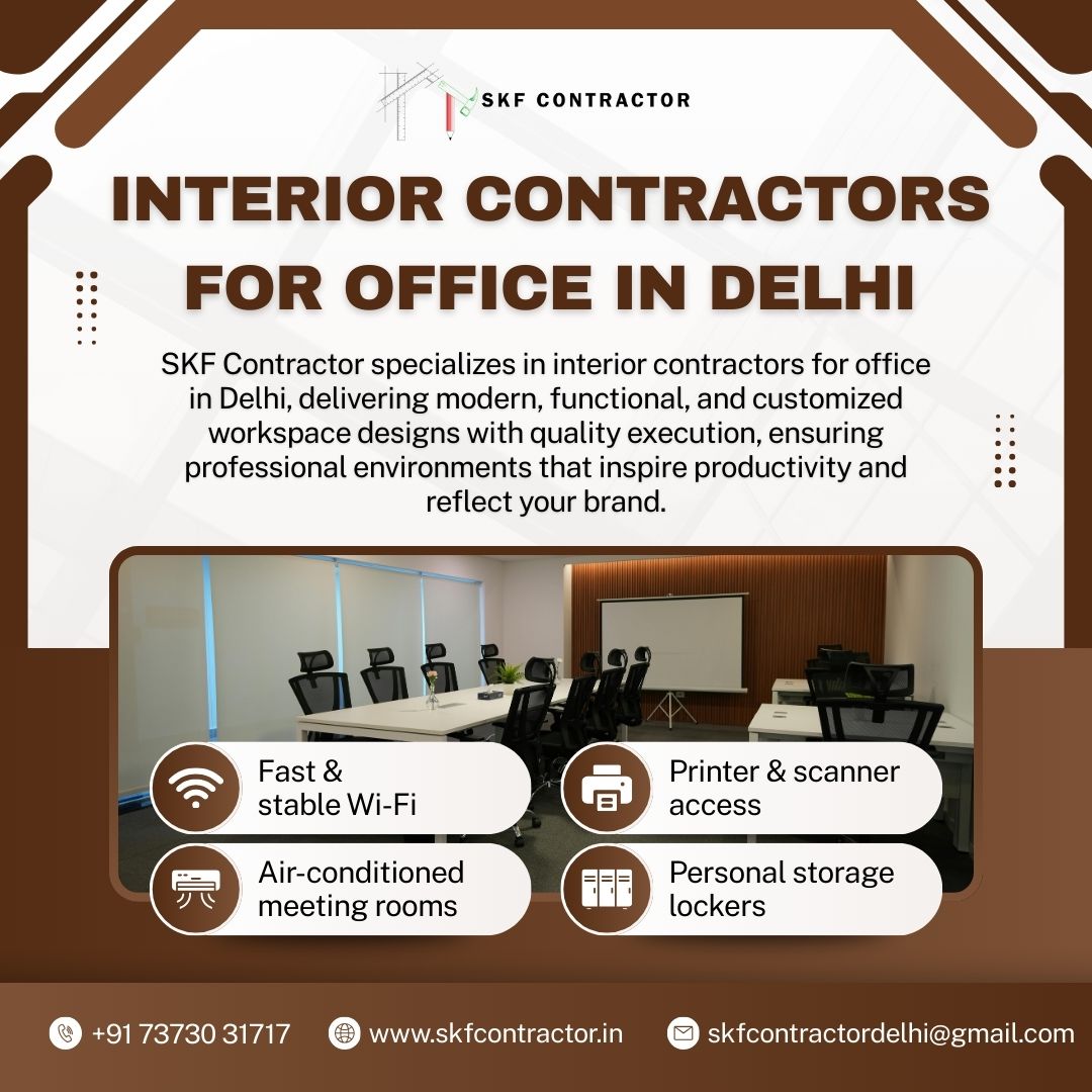 When it comes to trusted interior contractors for office in Delhi, SKF Contractor stands out as a reliable name. With expertise in modern office interiors, customized solutions, and quality execution, SKF Contractor ensures your office space is transformed into a perfect balance of style and practicality. Their proven track record makes them a top choice for businesses across Delhi.